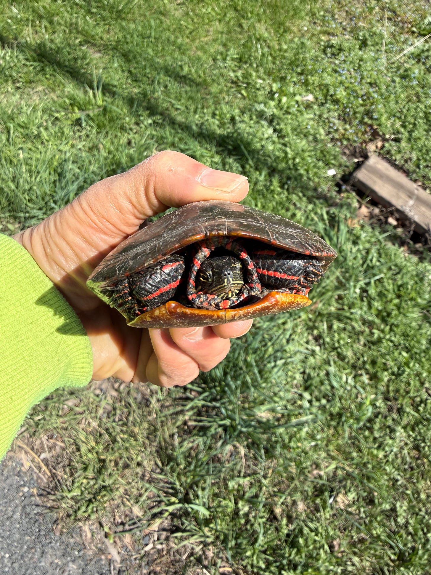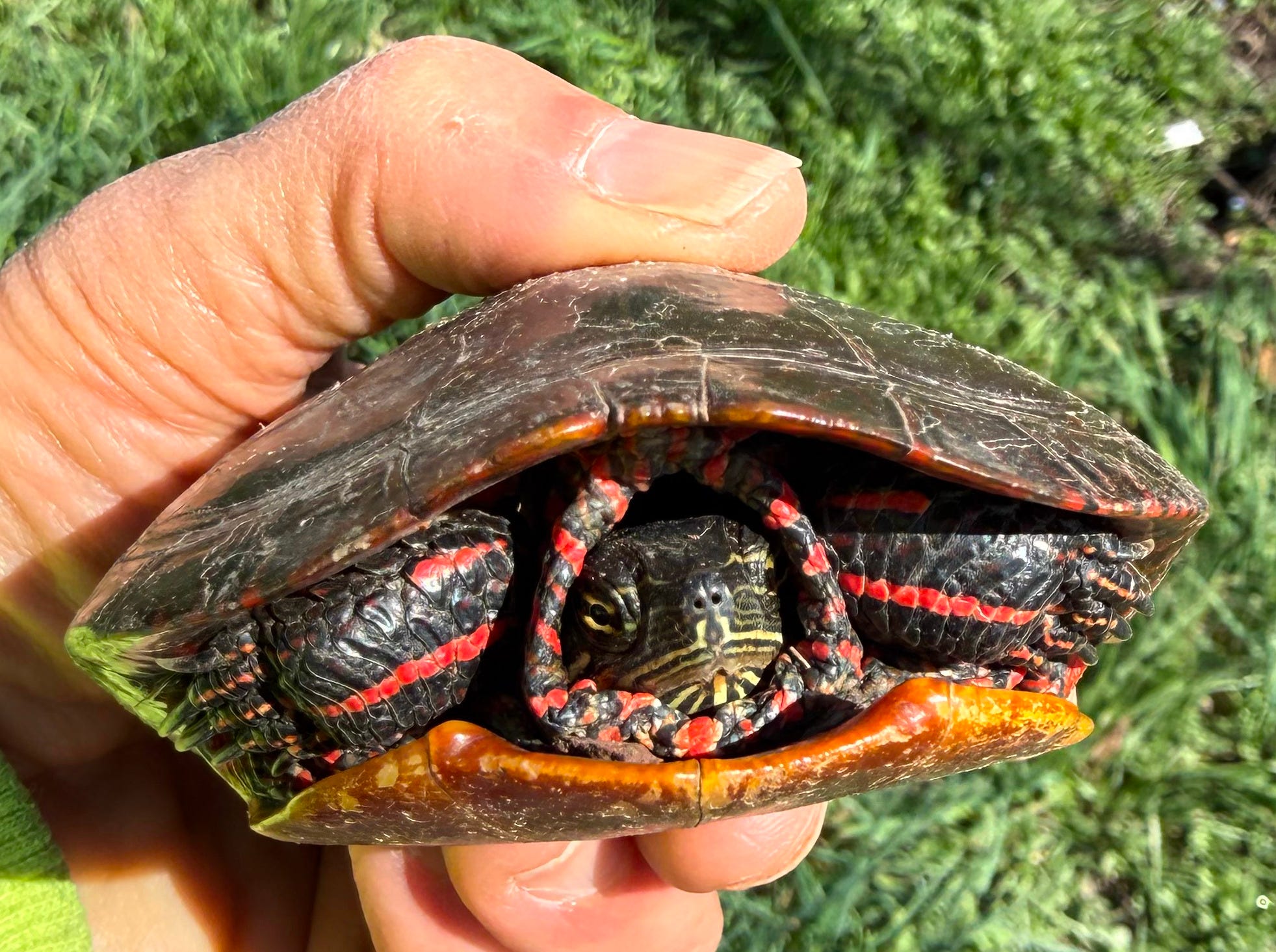 This beautiful creature (just look at its gorgeous red-orange stripes on its legs and neck ruff!), while retracted into its shell, did not look a bit worried about being held in my hand.