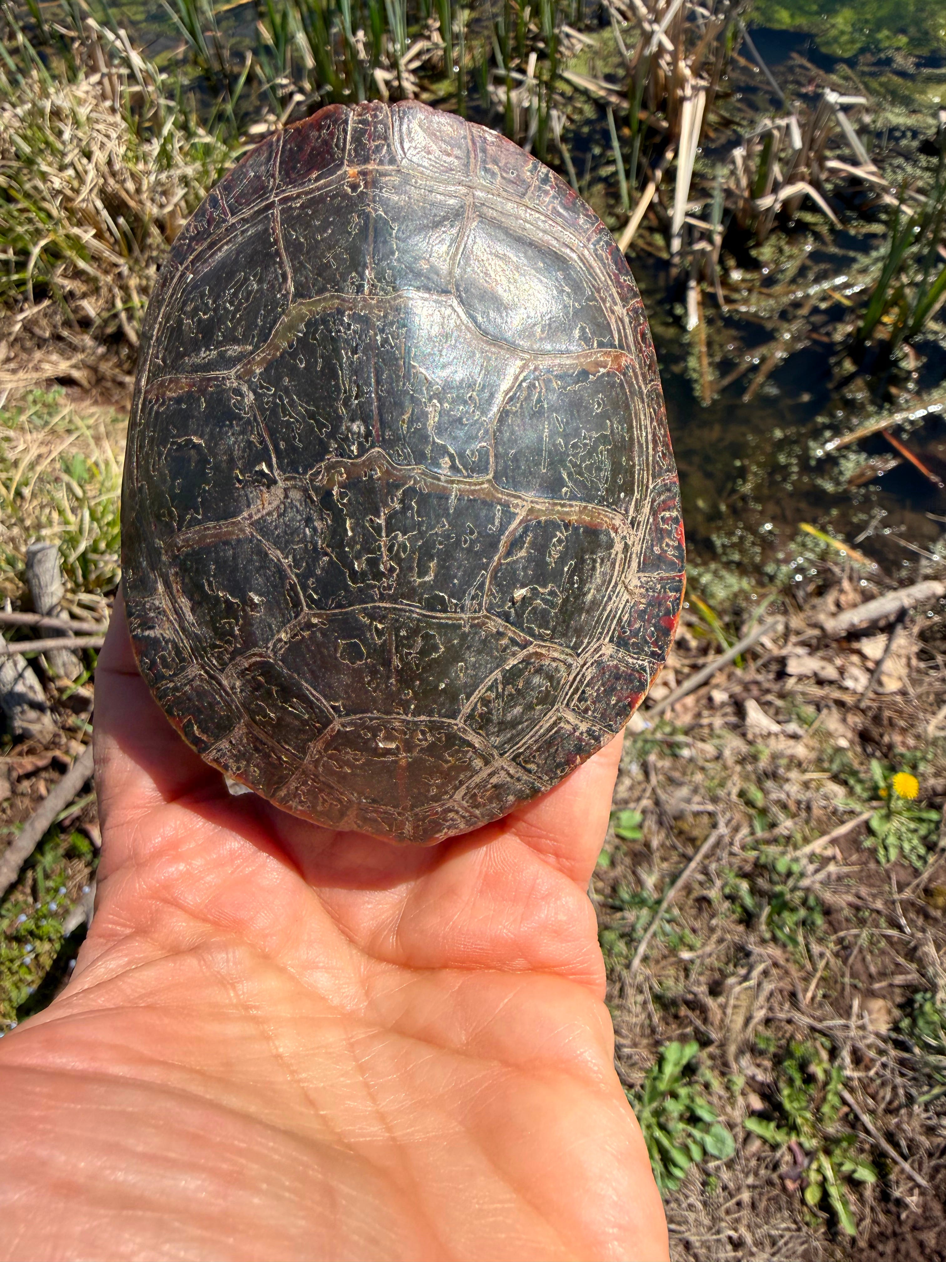 Pacha, Brutus, and I did a quick 3-point turn and returned to see. Sure enough! What I’d seen was no small flat rock. It was a young Painted Turtle, heading toward the pond just a stone’s throw away from the cartway of the road.