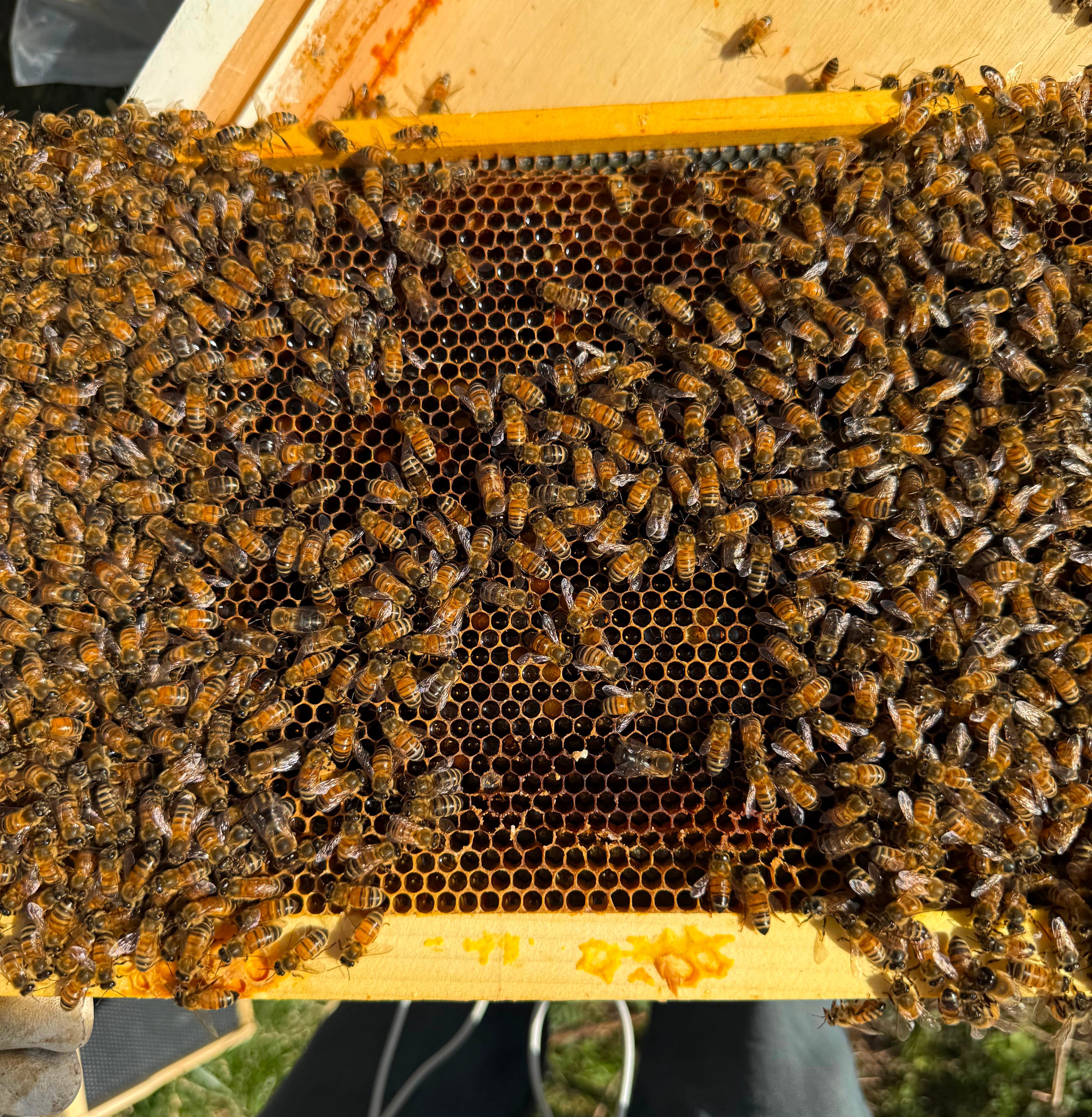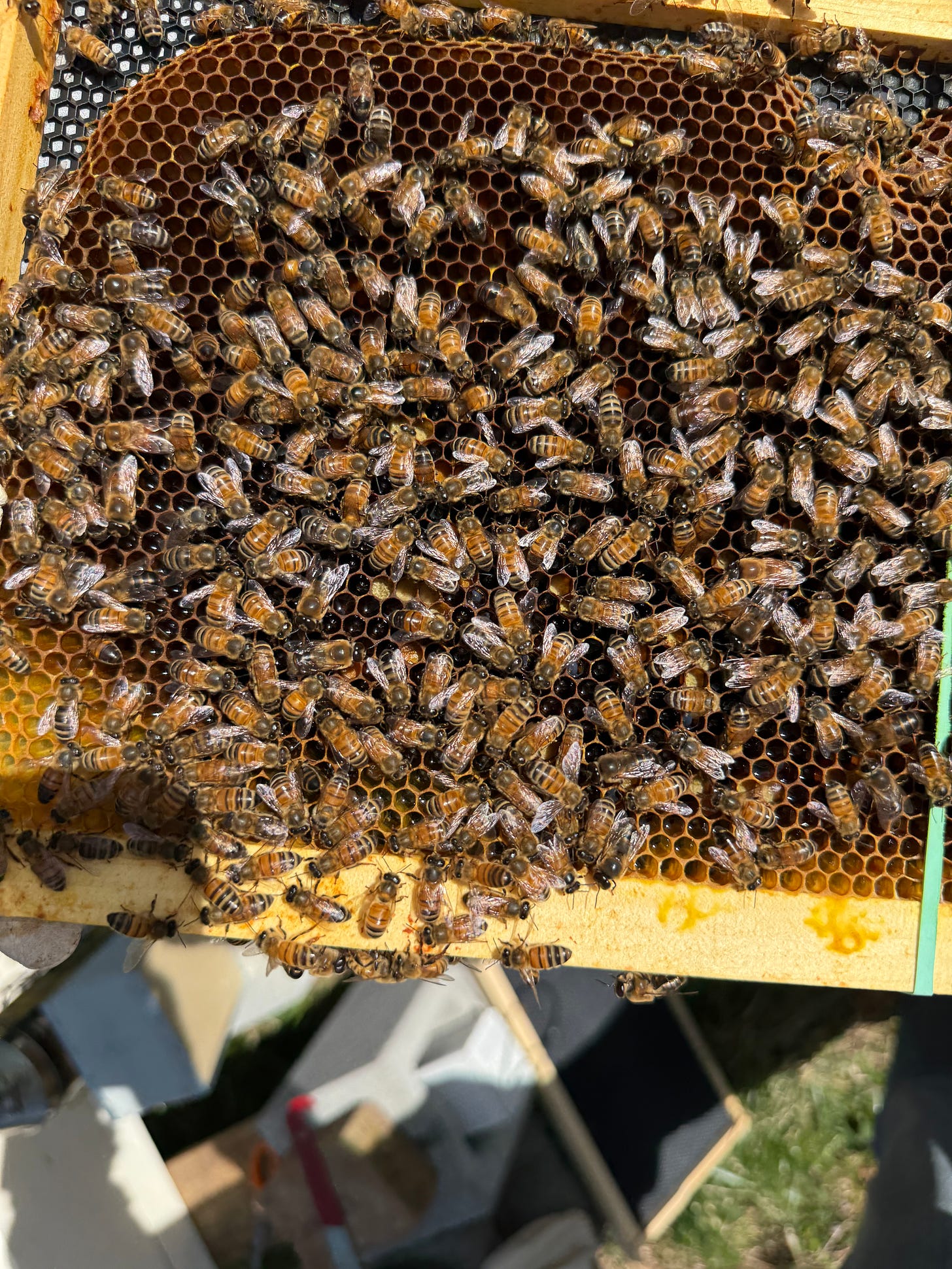 As of Sunday, 12 April 2026, we discovered (1) that both queens had tunneled out of their cages. But alas, we could not, in spite of our best efforts, (2) find the queen in either hive. Aaargh! And finally, (best of all?) we were able to take our time much more so this year and (3) could see – easily – lots and lots of eggs.