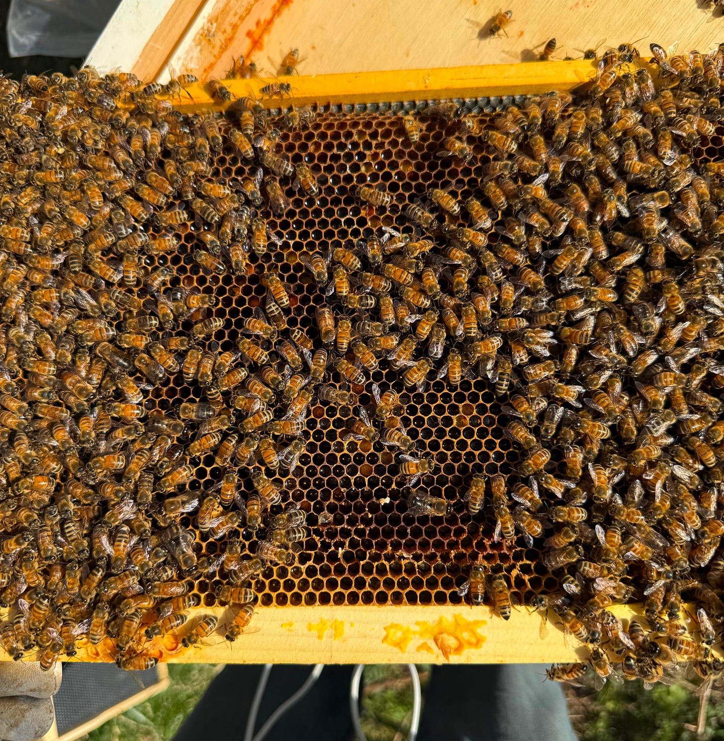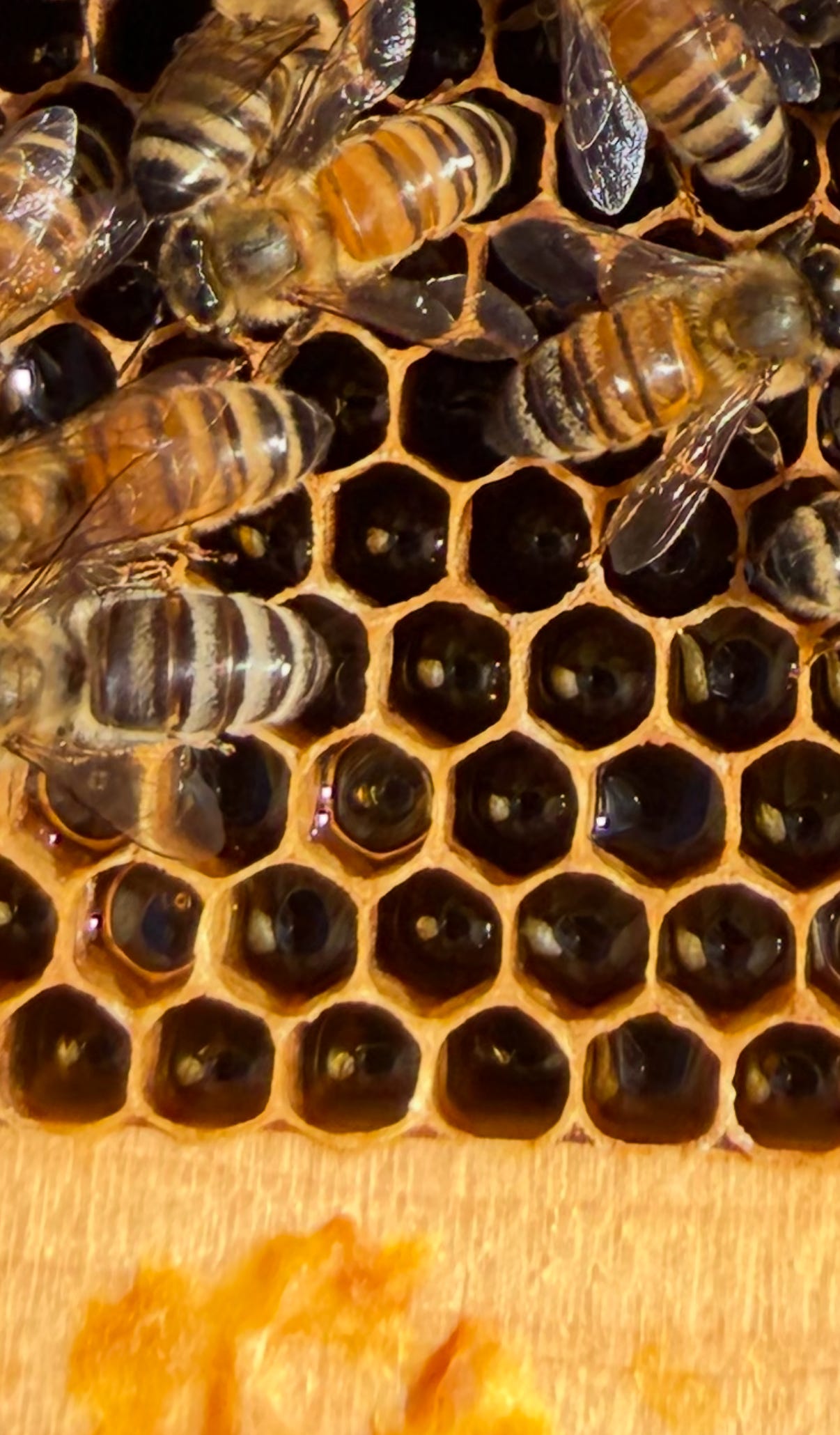 That’s harder than you might think. It’s one thing to think, “I’m going to find that queen;” or “I’m going to find evidence of each stage of the life cycle.” And it’s quite another to pull a frame out of the hive and have 3,000 bees running around right in front of you on one frame, often piling on top of each other, making it difficult to see anything that might be going on within the comb itself.